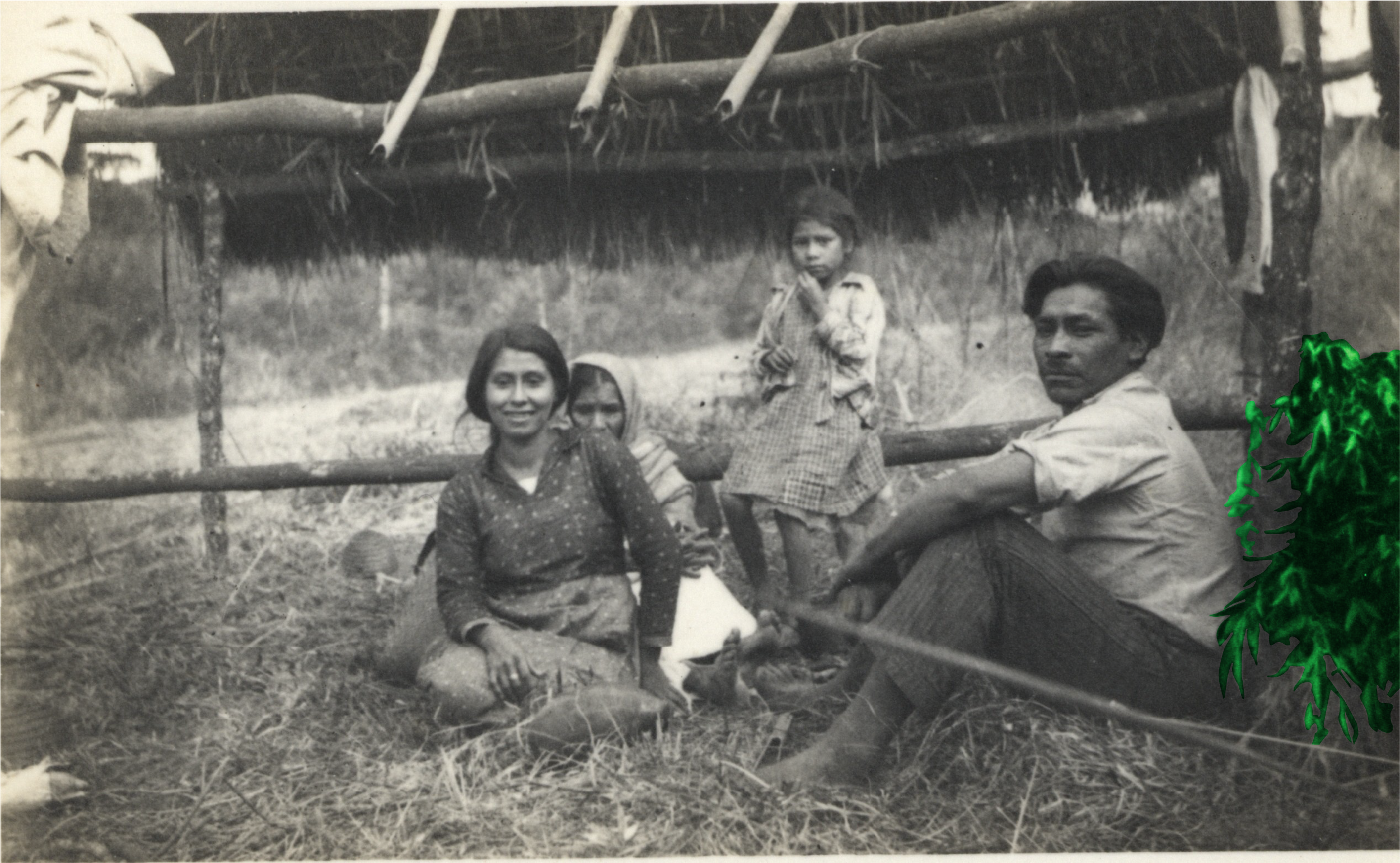 FLORENCIO: Ah esse já mostra mais assim a parte de ser temporário né? Uma cobertura assim mais pra fazer sombra mesmo. As crianças ali… Não sei se é eu que tô, mas parece que você vê já a erva mate no tronco atrás do homem ali. Você já vê um maço de folhas né? Não sei se é erva mate ou se é uma própria cobertura mesmo. Às vezes folha de taquara também é usada pra cobertura né. Então outros galhos pra poder cobrir ali.
