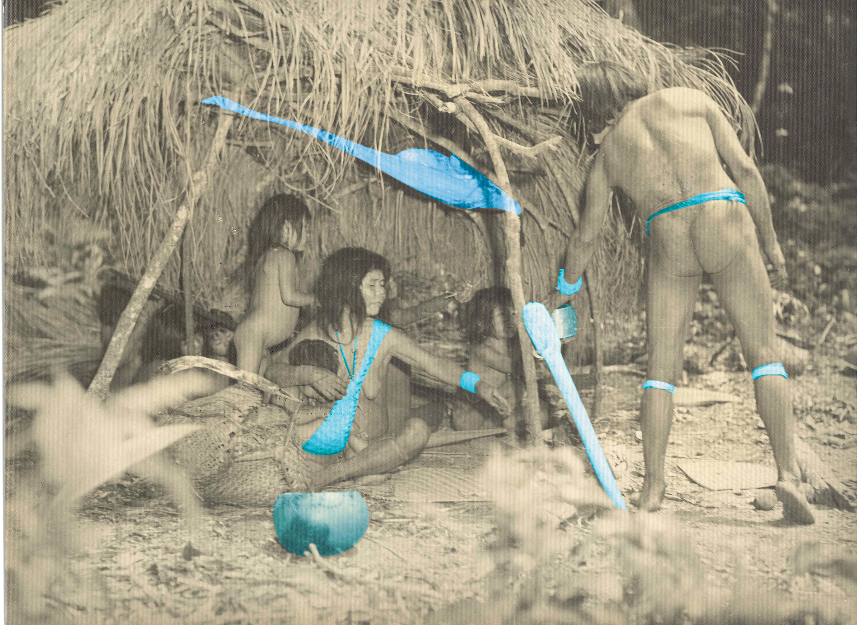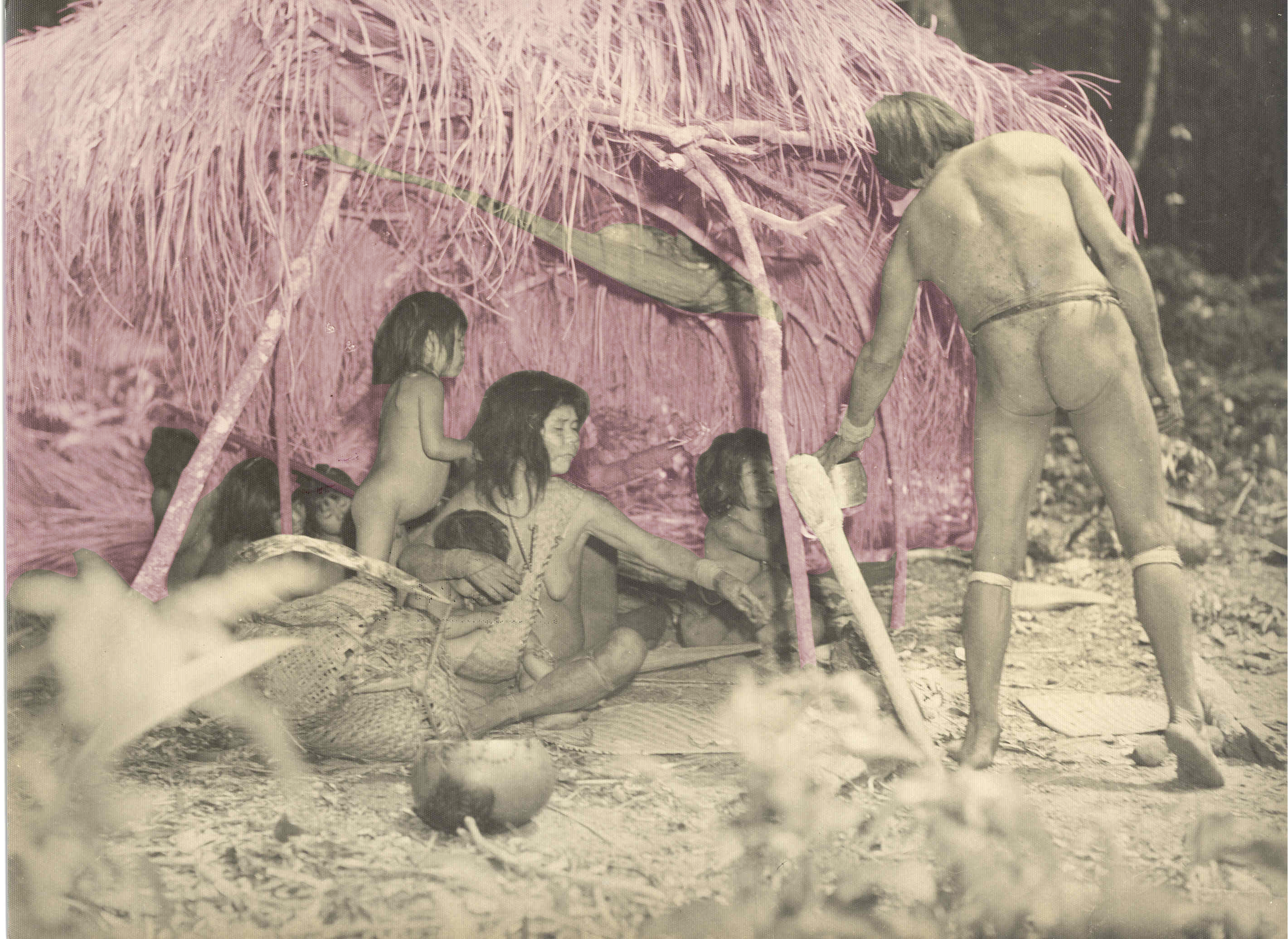 Brunno Douat: O que vcs vêm nessa foto assim Claudemir e Dival? É ... aparentemente a gente tem a impressão que seja a mesma construção da foto anterior, mas em ângulo diferente, mas o que puderem acrescentar nela, porque já dá pra ver mais o interior ali a família dentro, outros elementos fixados na cobertura né, já tem um arco e flexa aqui fixado na cobertura, enfim outros elementos aqui no chão coletados aqui parece, se vocês pudessem comentar um pouco sobre as outras coisas que aparecem nessa foto.